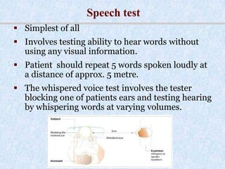 The whispered voice test is a simple and accurate test for detecting hearing impairment. WHISPERED VOICE TEST Stand arms length 2ft behind person. Patient occludes opposite ear with one hand.